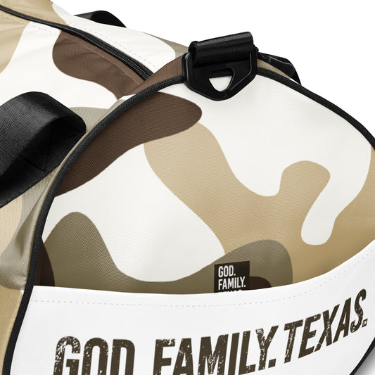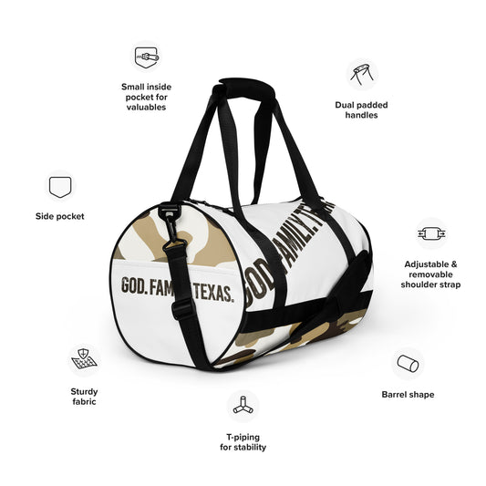 God. Family. Texas. 3 Crosses Camo Gym Bag