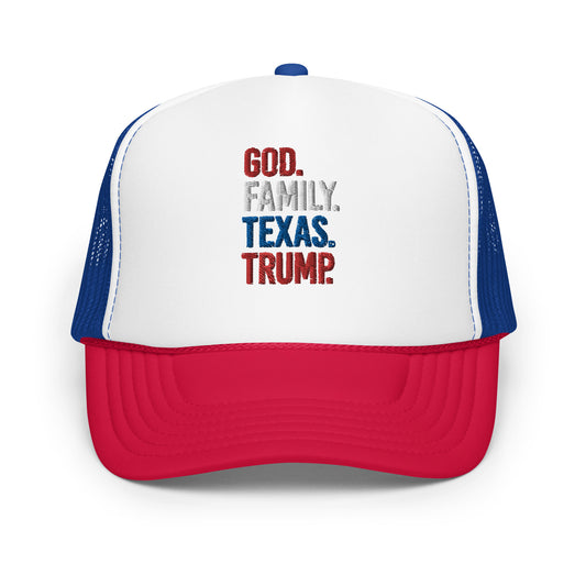 God. Family. Texas. Trump. Camouflage Trucker Hat